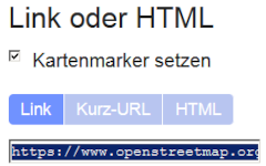 Eine Zeile tiefer kannst du dich nun entscheiden, in welcher Form du deinen Standort weitergeben möchtest. Es beginnt mit „Link“. Das Resultat ist der URL in ausführlicher Form. Er kann z.B. in einer E-Mail erwähnt werden. Oder du entscheidest dich für „Kurz-URL“; das ist dasselbe, absolut zielidentisch, aber verkürzt. Und schließlich ist da noch die Option „HTML“. Dies zeitigt ein Stück HTML-Code, der in deine eigene Website eingebaut werden kann.